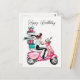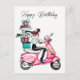 Ein Mädchen, das auf einem rosa Roller mit vielen Geschenken fährt.