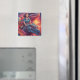Dieser Magnet hat ein künstlerisches Bild von einem Mädchen, das einen Drachen darauf reitet.