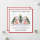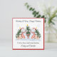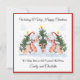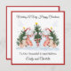 Diese Weihnachtskarte eignet sich für Zwillingsmädchen an ihrem ersten, zweiten oder dritten Weihnachtsfest. Das Design umfasst eine rote Kontur, hellblaue Schneeflocken, Weihnachtsbäume in Aquarellen, Bonbons, Geschenke und Zwillingsschneemänner.