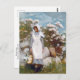 Eine kunstvolle Postkarte mit dem Gemälde Girl and Laurel (1879), von Winslow Homer (1836-1910), einem amerikanischen Künstler aus der realistischen Bewegung. Eine junge Frau, die eine weiße Schürze mit einer Motorhaube trägt, die einen Korbkorb aus Blume in der Nähe von Lorbeerbüschen hält.