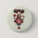 Button with a cute retro image featuring a whimsical girl with rosy cheeks and flowers in her hair. Carrying a green frog doll.