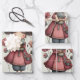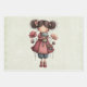 Wrapping paper sheets with a cute retro image featuring a whimsical girl with rosy cheeks and flowers in her hair. Carrying a green frog doll.