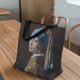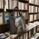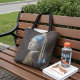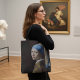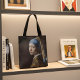 This tote bag features a cross-stitched replica of the renowned "Girl with a Pearl Earring" oil painting by Dutch Golden Age painter Johannes Vermeer, circa 1665. The painting portrays a European girl adorned in an "exotic dress," an "oriental turban," and a prominent pearl earring. The original painting is housed in the Muriithis collection in The Hague, Netherlands. The distinctive pattern and subject matter make this a uniquely enjoyable and sophisticated gift for art enthusiasts, book readers, and pearl earring aficionados.