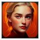 A girl with blue eyes on an orange background, dark black and crimson, photorealistic fantasies, personal iconography, detailed character design, shiny/glossy