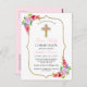 Laden Sie Freunde und Lieben ein, um die erste heilige Kommunion Ihrer Tochter mit dieser hübschen rosa Blumen- und Goldkreuz heiligen Kommunion Einladung Postcard zu besuchen. Die Einladung dieses Mädchens zur 1. Kommunion mit einem schlichten weißen Hintergrund und einem schönen goldenen Kreuz mit einem rosa Blumenstrauß. Die Rückseite dieser rosa heiligen Kommunion Einladung hat einen weichen rosa Hintergrund mit sehr hellrosa Polka Punkte. Personalisieren Sie die erste Kommunion dieses Mädchens mit dem Namen und dem Ort Ihres Kindes.