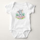 Mädchen Elefantenbaby Shirt mit einem hübschen kleinen Elefanten mit einem rosa Bogen auf einem Palmenblatt und rosa Bannerhintergrund. Dieses hübsche personalisierte Girl-Shirt lässt sich leicht mit dem von Ihnen gewünschten Text auf dem Banner anpassen. Sie können auch mehr Text auf der Rückseite und darunter hinzufügen.