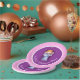 Niedliche Weihnachtsenmalerei auf personalisiertem Pink-Weiß-Polka-Punkt mit lila festlichen Tellern. Personalisieren Sie Ihre eigenen Party- oder Veranstaltungsdetails. Ideal für Party zu Weihnachten oder für Engelsveranstaltungen. Original Aquarellkunst und Design von Sarah Trett.