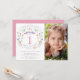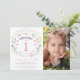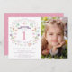 Diese hübsche und elegante Einladung zum ersten Geburtstag bietet einen illustrierten Blumenkranz mit den Worten "Let's Celebrate" um die Nummer 1. Die Textfarbe, der Schriftart, die Nachricht und das Foto können nach Ihren Wünschen geändert werden. Auf der Rückseite des Einladens befindet sich ein rosa Hintergrund (der in eine beliebige Farbe getauscht werden kann) mit einem weißen Quarterfolienmuster. Ein idealer Weg, um die Gäste zum Geburtstag eines Mädchens einzuladen.