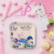 Fairy Wonderland paper plates; Turn your girl's birthday into a fairy wonderland with our charming plates! The design includes purple and blue mushrooms, a fairy, and butterflies with purple flowers against a light pink background. Customizable details ensure a personal touch, and the mix of script and sans serif fonts adds whimsical elegance. Capture the magic—get your fairy-themed plates today!