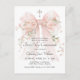 Beautiful feminine styling in this Girl's First Holy Communion post card Invitation with a pastel pink watercolor bow embellished with pink flowers. A lovely silver cross sits above the bow as a symbol of Christianity. The attractive text template arranges your text in classic style. Easy to personalize and prepare for this momentous occasion in the life of your daughter. The back of the card has additional text that you can edit with your text. This design is perfect a girl celebrating this important religious rite.