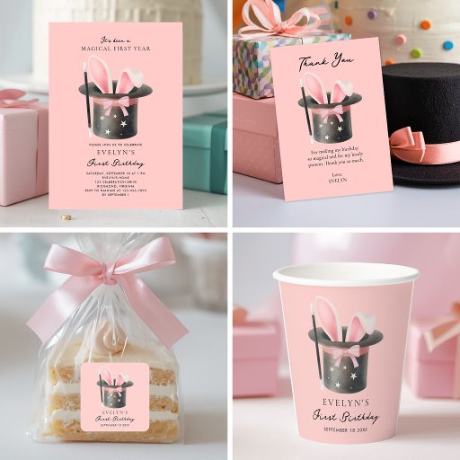 For the little girl's first birthday. Celebrate your little girl’s magical first year with this charming magic themed pink bow birthday invitation. Featuring a sweet magician’s hat with bunny ears, this soft and whimsical design is perfect for a girl’s 1st birthday party. Fully customizable and beautifully minimal, it sets the tone for a cute, modern, magic‑themed celebration. Personalize with your little one's name and event details.