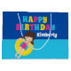 Kinderschwimmbad Happy Birthday Geschenktasche für ein brünettes Mädchen im Schwimmteam während des Sommers. Ein heller, lustiger Pop und ein cooles Schwimmmädchen in einem Schlauch. Für ein besonderes Kindergeschenk.