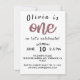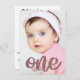 Minimalistische Rose Gold Glitzer Erstgeburtstag Einladung. Designmerkmale eines einfachen Fotos mit "eins" in trendiger moderner Rose Gold Glitzer. Fügen Sie Party-Details auf der Rückseite hinzu.