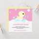 Niedliche Gummi Duschkabine für Mädchen mit gelber Gummifotze und rosa-weißem Hintergrund. Die Rückseite der Einladung ist gelb mit Pinkdots. Passen Sie Ihre Duschdetails mit unserer einfachen Vorlage an.