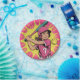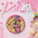 Eine lebendige Pop Art Illustration präsentiert ein junges Mädchen in einem temperierten Softballspiel. Das Mädchen strahlt jugendliche Energie aus und ist in einem leuchtend rosa Trikot verkleidet, wobei die Zahl "7" prominent angezeigt wird, und ein entschlossenes Lächeln leuchtet ihr Gesicht auf, während sie einen aquamarinen Schläger ergreift, der bereit ist, sich mit dem Softball zu verbinden. Der dynamische Hintergrund explodiert mit energetischen Wirbel und Formen im Graffiti-Stil in Gelb und Rosa und schafft ein Gefühl von Bewegung und Aufregung. Weiche, diffuse Sonneneinstrahlung badet die Szene, betont die kühnen Farben und spielerische Ästhetik, während der Softball in der Luft in der Nähe der Fledermaus aufgehängt wird.