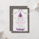 Eine Geburtstagsfeier mit einem rustikalen Camping-Thema. Invite hat eine Illustration eines lila Tipis mit Zickzack Design oben und einem lila Kanu unten. Einladend bietet auch Bunt oben und ein Holz inspiriert Hintergrund. Personalisieren Sie den Text mit Details zu Ihrem Anlass.