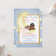 Afrikanisches amerikanisches Mädchen Twinkle winzige kleine Sternendusche Einladung mit bezauberndem Afroamerikanisches Baby Mädchen mit niedlich rosa Bug auf einem hübschen gelben Mond mit weichen Wolken, die einen leuchtenden gelben Stern auf einem hübschen, blau-gelben Sternrosa und goldenen Hintergrund halten. Sie können diese wunderschöne kleine, bunt duftende Babydusche ganz einfach an Ihre Veranstaltung anpassen, indem Sie einfach Ihre Details im Schriftart-Stil Ihrer Wahl hinzufügen. Dies ist ein bedrucktes Design ohne echte Folie, Glitzer, etc.