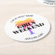 Girls Wochenende Junggeselinnen-Abschied Custom Round Paper Untersetzer. Erstellen Sie Ihre eigenen Party-Vorräte und Zubehör. Personalisieren Sie mit Zielnamen und lustigem Zitat. Girly Design mit tropischer Palme. Spaß für Brautparty, Junggeselinnen-Abschied, Girls Nacht out, Hochzeit, Verlobung, Jubiläum, Party, Geburtstag, Feiern etc. Niedliches Design mit stilvoller Typografie. Einzigartige Geschenkidee für Freunde, Familie, Gäste, Brautmädchen, Braut, Gruppe, Büromitarbeiter, Kollegen, Partner etc.