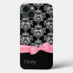 Stilvolle iPhone-Hülle, mit schwarz-weißem Damast-Muster, oben auf dem Gehäuse und einem schwarzen Hintergrund, unten. Die Grafik eines hübschen rosa Schleifen und Bogen verläuft zwischen den beiden Hintergründen quer durch das Gehäuse. Rosa Skripttext am unteren Rand ist bereit, zu personalisieren. Hübscher Weg, um Ihr iPhone zu schützen und stilvoll aussehen, und macht eine großartige personalisierte Geschenkidee. Wählen Sie aus matt oder glänzend Finish auf diesem großartigen Gehäuse.