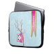 Girly blaue wunderliche Eulen-Laptop-Hülse. Kleine rosa Eule, die auf einer Kirschblütenniederlassung mit Wirblem wunderlichem Himmel sitzt. Addieren Sie Ihren Namen oder Text!