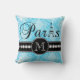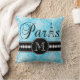 Dieses schwarze und girly blaue Chic Throwkissen mit Vintagem Damastmuster und personalisiert Ihre Monogramminitiale, das Wort "Paris" mit dem Eiffel-Turm und eine Schriftzeile weiße Diamanten auf einem schwarzen Band schaut in Ihrem Schlafzimmer oder in Wohnzimmer als Akzentkissen fantastisch. Monogramm-Galerie Gifts© Elke Clarke entwirft ©