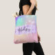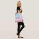 Niedliche Tasche mit farbenfrohen rosa, pfirsichfarben, lila, lila, blau und grün einhornfarben Regenbogenherzen funkelnd Hintergrund. Ihr individuelle Name und Monogramm sind in einem handgeschriebenen, eleganten Skript mit einem lila lila Einhorn Pinselstrich Stripe Hintergrund geschrieben. Ein perfektes Geburtstag- oder Weihnachtsgeschenk!