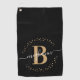 Girly, modern, trendig, elegant, schwarz und gold monogramm Anfangsname Skript personalisiertes mit Monogramm Golfhandtuch. Mit einem Monogramm-Initial- und einem gürtelhaften Namensskript in einem handgeschriebenen Kalligraphie-Schwanz-Schriftart und einem gepunkteten Kreisrahmen um Ihr Monogramm. Große Frauengeschenke für Mutter, Geburtstag, Schwester, Hochzeit, Brautparty, süße 16 Geburtstagsparty und Babydusche und für alle, die Lieben hübsch moderne Sachen.