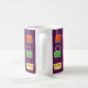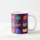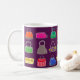 Diese Tasse hat ein Muster von Geldbeutel und Handtaschen in verschiedenen Stilen und Farben. Der Hintergrund ist dunkel lila.
