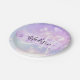 Niedliche Papiertafel mit farbenfroher rosa, lila, lila und blauer, einhornfarbener Regenbogenhaut funkelnd. Ihr individuelle Name und Monogramm sind in einem handgeschriebenen, eleganten Skript mit einem lila lila Einhorn Pinselstrich Stripe Hintergrund geschrieben.