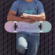 Personalisierte Girly Skateboard mit funkelnd Imitaten Gold Glitzer Confetti vor einem eintönigen pastellrosa, lila, blau und grün Hintergrund. Fügen Sie Ihren Vornamen in einem stilvollen lila Skript mit Swashes hinzu.