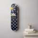 Ein Skateboard mit einem gürtelhaften Retro-Mod-Blume-Muster oben mit weißen Farbtönen mit gelben Mittelpunkten vor marinebaublauem Hintergrund und einem trendigen blau-weißen Polka-Punktmuster unten. Personalisieren Sie diese, indem Sie Ihren Namen hinzufügen. Perfektes Geschenk für ein stilvolles Mädchen.