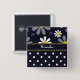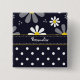 Ein Knopf mit einem girly retro Mod-Blumenmuster auf die Oberseite mit weißen Gänseblümchen mit gelben Mitten gegen einen Marineblauhintergrund und ein trendy blaues und weißes Polkapunktmuster auf der Unterseite. Personifizieren Sie, indem Sie Ihren Namen addieren. Vervollkommnen Sie Geschenk für ein stilvolles girly Mädchen.