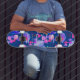Farbenfrohe lila, marinöse und rosa abstrakte moderne Skateboard mit personalisiertem Namen in lässigen handgeschriebenen weißen Typografie-Skripten.