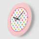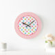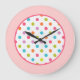 Moderne, gürtelrosa Polka-Dot-Wandleuchten mit bunten Punkten und rosa Akzent-Farbe auf der Uhr in diesem Uhrendesign für Mädchen, Frauen oder Uhren für ein Kinderschlafzimmer der Uni. Dieses Girly Design hat eine Menge Farbe und Charakter.