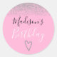 Personalisierte gürtelrosa und silberne Glitzer Glitzern Herzklassiker rund um Geburtstag Aufkleber. Dieser hübsche und glamouröse Aufkleber enthält Ihren personalisierten Namen in schwarz und das Wort "Geburtstag" in weiß mit einem rosa Hintergrund. Die Oberseite des Aufklebers ist mit funkelnd silbernen Glitzer Konfetti dekoriert, und die Unterseite hat einen silbernen Glitzer Herz in der Mitte. Sie können die Textfarbe und den Stil des Schriftartes mit der Option Anpassen ändern.