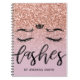 Moderne modische Rose Gold Glitzer Lashes Notebook. Design mit gebürstetem Kalligraphieskript ''Lashes'' auf dem goldenen Hintergrund der Rose. Ideal für Ihr Lashbusiness.