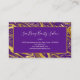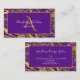 Dieses trendige, berufliche und einzigartige Glam Girly Design verfügt über ein großes, anpassbares Monogramm in dunklem Gold auf der Vorderseite in eleganter Display-Typografie zusammen mit einem anpassbaren Namen in schönem Drehbuch mit einem handgeschriebenen Look in weiß in einem goldgestrichenen königlichen lila Rechteck, mit dem Titel unten. Der Hintergrund umfasst verglasten Marmor, der mit Glitzer verziert ist und auf einem lila königlichen Hintergrund strahlt. Auf der Rückseite der Karte ist der Text benutzerdefinierbarer. Sie können dieses Element personalisieren, indem Sie das Monogramm, den Namen und den Text in der Produktvorlage ändern.