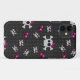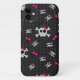 Niedliches gotisches Design mit kleinen weißen Schädeln mit rosa Bögen, Set vor schwarzem Hintergrund mit schwarz-weißen Punkten und rosa Kirschen.
