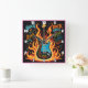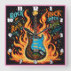 Eine lebendige Gitarre mit farbenprächtigen Flammen, umgeben von energischen Schriften, die das Wesen von Rock und Roll feiern.