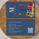 Moderne Gitarrenlehrer Musiker Visitenkarte mit QR Code. Psychedelische akustische Gitarre, semiakustische Gitarre und E-Gitarre in hellen Farben auf dunkelblauem Hintergrund mit personalisiertem Monogramm, Name, Details und QR-Code. Das perfekte coole Visitenkartendesign für Gitarristen, berufliche Musiker, Entertainer und Musiklehrer. Original-Kunstwerk von Catherine Sweetman