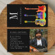 Stilvolle Guitar Lehrer Custom Foto Visitenkarte. Diese lebendige Visitenkarte bietet psychedelische akustische, semi-akustische und elektrische Gitarren in einer beeindruckenden Farbpalette vor einem auffallenden schwarzen Hintergrund. Komplett mit einem personalisierten Foto, Monogramm, Ihrem Namen, Kontaktdaten in allen stilvollen Typografien, ist diese Karte die perfekte coole und farbenfrohe Einführung für Gitarrentrainer, Gitarristen, berufliche Musiker, Entertainer und Musiklehrer. Original-Kunstwerk der Künstlerin Catherine Sweetman.