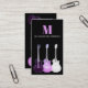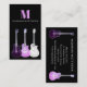 Coole Pop Art semiakustische Gitarren schmücken dieses coole funky lila und rosa auf einem schwarzen Hintergrund mit personalisiertem Monogramm und Namen. Fügen Sie Ihre eigenen Daten mit der Vorlage hinzu, um die perfekte Visitenkarte für berufliche Musiker, Gitarrenmusiklehrer und Musikliebhaber zu erstellen. Original-Kunstwerk von Catherine Sweetman