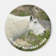 Runder, dekorativer Magnet, der das Foto einer Hornziege zeigt, einem Bewohner des Glacier Nationalparks, Montana. Wählen Sie Ihre Magnetgröße aus. Macht ein tolles Reise-Andenken!
