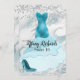 Glamouröses Aquamarin und Silber Sweet 16 / Quinceanera Geburtstagsfeier Einladung, mit Grafiken eines extravaganten Aquamarine-Gown, Aquamarine High Heels und Silber-Glitzer-Set vor einem schönen marmorierten Hintergrund. Personalisieren Sie den Text für den besonderen Tag Ihrer Tochter.
