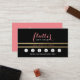 Koordiniert bis 12.01 Uhr mit dem Glam Black Pink Gold Lash Salon Business Card Template. Ein rosa Kalligraphie-Schriftart Zauber Ihren Namen oder Firmennamen mit schwindenden Schwänzen und zarten Kurven auf dieser lash Salon Loyalität Lochkarte. Ermuntern Sie zu wiederholten Besuchen Ihrer Kunden. Aktualisieren Sie die Werbeaktion für Ihr individuelles Angebot. Dieses Design ist Teil einer Reihe von aufeinander abgestimmten Büroartikeln, um Ihr lash-salon-Geschäft zu markieren. © 1201AM CREATIVE