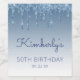These chic fiftieth birthday wine bottle labels feature a sparkly blue faux glitter drip border and blue ombre background. Personalize them with her name in blue handwriting script, with her birthday and date below in blue sans serif font.