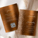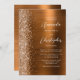 The left-hand edge of this elegant modern wedding invitation features a copper faux glitter border. The customizable text combines white handwriting, copperplate and italic fonts on a copper faux brushed metal background. The reverse side provides space for wedding details on a copper brushed metal background, along with a QR code guests can scan to visit your website and RSVP, which saves the cost of printing and mailing separate RSVP cards.