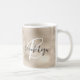 Diese elegante personalisierte Kaffee-Tasse zeichnet sich durch ihre Monogramm und ihren Vornamen in modernem Weiß- und Holzkohle-Grauskript aus, auf einem funkelnd Hintergrund von Champagner-Imitat-Folie und Glitzer.