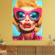 Ein auffallendes, hochmodernes Portrait einer glamourösen Diva mit voluminösem blonden Haar, einer übergroßen heißen rosa Katzenauge-Sonnenbrille, kühnen roten Lippen und einer elektrisch blauen Augape. Das Aussehen ist heftig, Retro und unentschuldbar fabelhaft - ein Pop-Kunst-Traum in lebendiger Farbe.