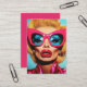 Ein auffallendes, hochmodernes Portrait einer glamourösen Diva mit voluminösem blonden Haar, einer übergroßen heißen rosa Katzenauge-Sonnenbrille, kühnen roten Lippen und einer elektrisch blauen Augape. Das Aussehen ist heftig, Retro und unentschuldbar fabelhaft - ein Pop-Kunst-Traum in lebendiger Farbe.